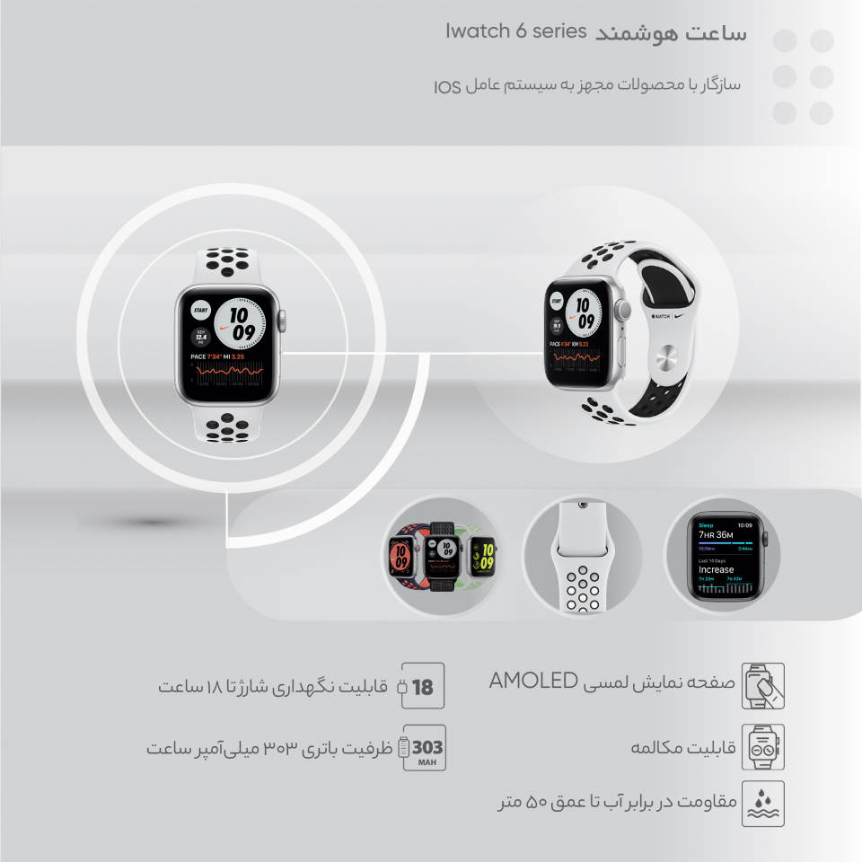 اپل واچ سری 6 مدل 44mm Space Gray Aluminum Case with Nike Sport Band از ساعت‌های هوشمند زیبای برند اپل است.این اپل‌واچ 44 میلی‌متری ویژگی‌های خاصی دارد که می‌توان از میان آن‌ها به مقاومت در برابر آب تا عمق 50 متری اشاره کرد. مقاومت در برابر آب این مدل موجب می‌شود، کاربر هنگام بارش باران یا شست‌وشوی دست، بدون نگرانی از این گجت استفاده ‌کند، همچنین قادر به استفاده از آن برای برخی ورزش‌های آبی (نظیر شنا در آب‌های کم‌عمق و کوتاه‌مدت) باشد..اپل واچ سری 6 از تراشه S6 بهره می‌برد که بنابر گفته‌های کارشناسان اپل تا 2.5 برابر سرعت بیشتری نسبت به اپل واچ سری 5 خواهد داشت.سنسورهای متنوعی که برای پایش فعالیت‌های فیزیکی در نظر گرفته شده است مانند سنسور تشخیص مقدار اکسیژن خون، سنسور هشدار تپش قلب نامنظم ، سیستم مسیریابی جی‌پی‌اس از قابلیت‌های جذاب این مدل از سری جدید اپل‌واچ هستند. گفتنی است در این سری کمپانی اپل با همکاری شرکت نایکی طرح لوگوی این برند ورزشی را روی بند و صفحه نمایش این محصول حک کرده است که این امر موجب جذابیت بیشتر این ساعت هوشمند در میان ورزشکاران شده است.